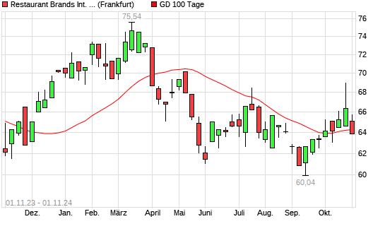 Mit dem Rücksetzer auf 64,06 EUR hat die Restaurant Brands International-Aktie am 31.10.2024 die 100-Tage-Linie nach unten gekreuzt.