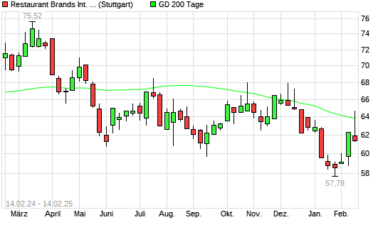 Mit dem Rücksetzer auf 62,96 EUR hat die Restaurant Brands International-Aktie am 13.02.2025 die 200-Tage-Linie nach unten gekreuzt.
