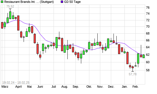 Mit dem Rücksetzer auf 61,14 EUR hat die Restaurant Brands International-Aktie am 17.02.2025 die 50-Tage-Linie nach unten gekreuzt.