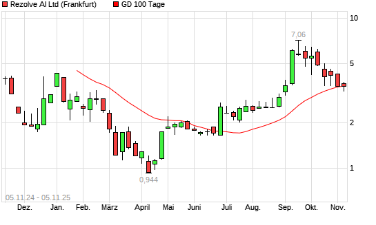 Mit dem Rücksetzer auf 3,33 EUR hat die Rezolve AI-Aktie am 04.11.2025 die 100-Tage-Linie nach unten gekreuzt.