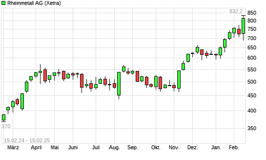 Mit dem Anstieg auf 817,40 EUR hat die Rheinmetall-Aktie (ISIN DE0007030009) am 14.02.2025 ein neues All-Time-High erreicht und damit den Kurs vom 03.02.2025 eingestellt.