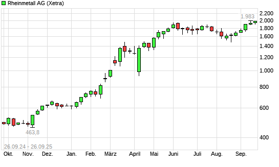 Mit dem Anstieg auf 1.975,50 EUR hat die Rheinmetall-Aktie (ISIN DE0007030009) am 25.09.2025 ein neues All-Time-High erreicht und damit den Kurs vom 24.09.2025 eingestellt.