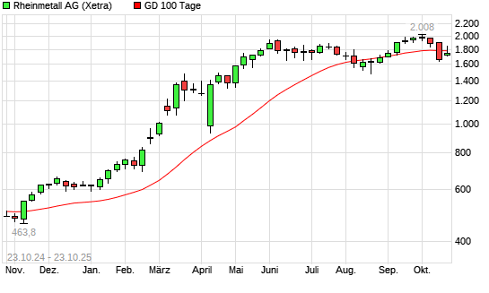 Mit dem Rücksetzer auf 1.769,00 EUR hat die Rheinmetall-Aktie am 22.10.2025 die 100-Tage-Linie nach unten gekreuzt.