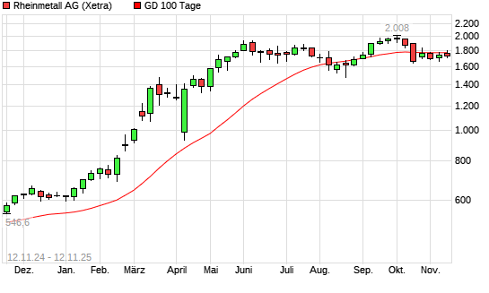 Mit dem Rücksetzer auf 1.733,50 EUR hat die Rheinmetall-Aktie am 11.11.2025 die 100-Tage-Linie nach unten gekreuzt.