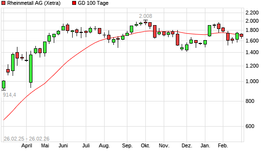 Mit dem Rücksetzer auf 1.687,50 EUR hat die Rheinmetall-Aktie am 25.02.2026 die 100-Tage-Linie nach unten gekreuzt.