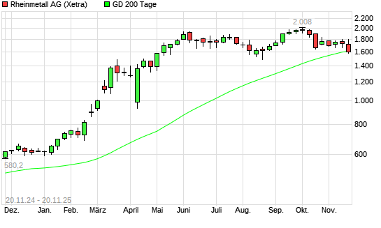 Mit dem Rücksetzer auf 1.616,00 EUR hat die Rheinmetall-Aktie am 19.11.2025 die 200-Tage-Linie nach unten gekreuzt.