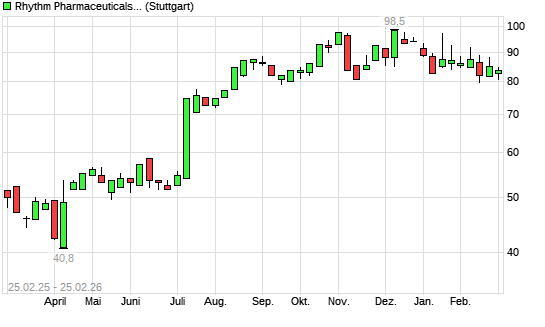Mit dem Rücksetzer auf 77,50 EUR hat die Rhythm Pharmaceuticals-Aktie (ISIN US76243J1051) am 24.02.2026 ein neues 6-Monats-Tief erreicht und damit den Kurs vom 23.02.2026 eingestellt.