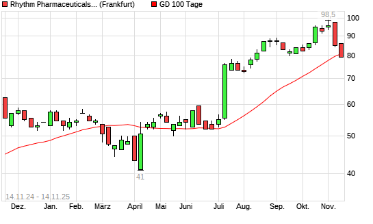Mit dem Rücksetzer auf 79,50 EUR hat die Rhythm Pharmaceuticals-Aktie am 13.11.2025 die 100-Tage-Linie nach unten gekreuzt.Die Rhythm Pharmaceuticals-Aktie befindet sich seit dem 30.06.2025 ...weiterlesen
