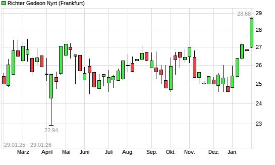 Mit dem Anstieg auf 28,32 EUR hat die Richter Gedeon-Aktie (ISIN HU0000123096) am 28.01.2026 ein neues 12-Monats-Hoch erreicht und damit den Kurs vom 27.01.2026 eingestellt.