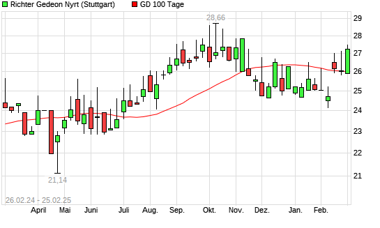 Mit dem Rücksetzer auf 26,24 EUR hat die Richter Gedeon-Aktie am 24.02.2025 die 100-Tage-Linie nach unten gekreuzt.
