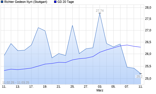 Mit dem Rücksetzer auf 26,50 EUR hat die Richter Gedeon-Aktie am 10.03.2025 die 20-Tage-Linie nach unten gekreuzt.