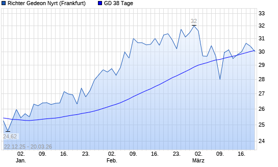 Mit dem Rücksetzer auf 30,04 EUR hat die Richter Gedeon-Aktie am 19.03.2026 die 38-Tage-Linie nach unten gekreuzt.