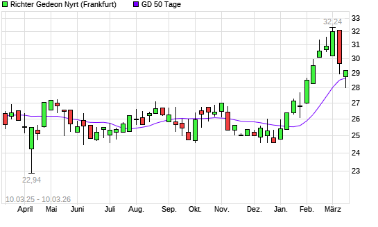 Mit dem Rücksetzer auf 28,00 EUR hat die Richter Gedeon-Aktie am 09.03.2026 die 50-Tage-Linie nach unten gekreuzt.