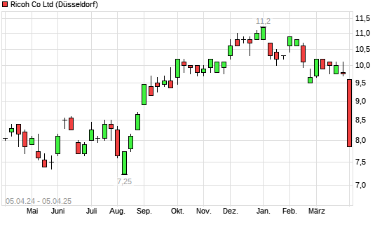 Mit dem Rücksetzer auf 8,25 EUR hat die Ricoh-Aktie (ISIN JP3973400009) am 04.04.2025 ein neues 6-Monats-Tief erreicht und damit den Kurs vom 03.04.2025 eingestellt.