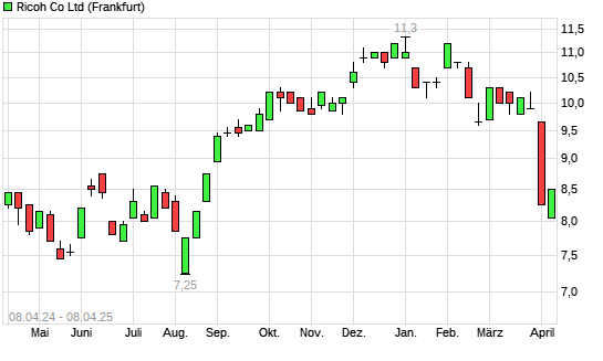 Mit dem Rücksetzer auf 8,05 EUR hat die Ricoh-Aktie (ISIN JP3973400009) am 07.04.2025 ein neues 6-Monats-Tief erreicht und damit den Kurs vom 04.04.2025 eingestellt.