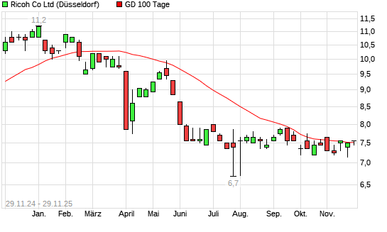 Mit dem Anstieg auf 7,60 EUR hat die Ricoh-Aktie am 28.11.2025 die 100-Tage-Linie nach oben gekreuzt.