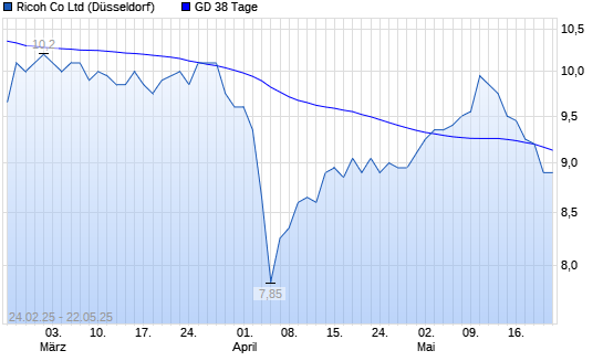 Mit dem Rücksetzer auf 9,10 EUR hat die Ricoh-Aktie am 21.05.2025 die 38-Tage-Linie nach unten gekreuzt.