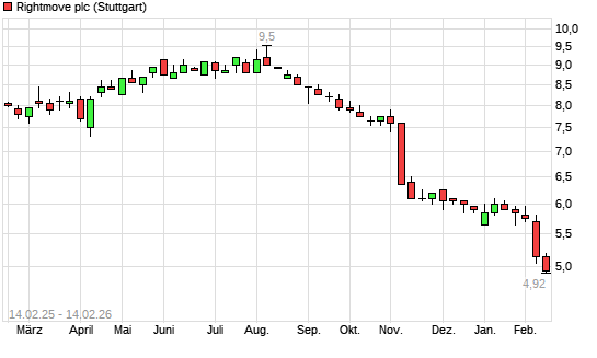 Mit dem Rücksetzer auf 4,82 EUR hat die Rightmove PLC-Aktie (ISIN GB00BGDT3G23) am 13.02.2026 ein neues 5-Jahres-Tief erreicht und damit den Kurs vom 12.02.2026 eingestellt.