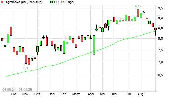 Mit dem Anstieg auf 8,55 EUR hat die Rightmove PLC-Aktie am 05.09.2025 die 200-Tage-Linie nach oben gekreuzt.