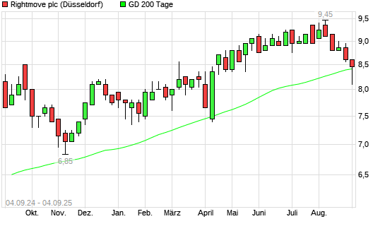 Mit dem Rücksetzer auf 8,30 EUR hat die Rightmove PLC-Aktie am 03.09.2025 die 200-Tage-Linie nach unten gekreuzt.