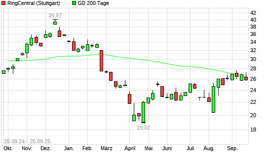 Mit dem Rücksetzer auf 25,74 EUR hat die RingCentral-Aktie am 24.09.2025 die 200-Tage-Linie nach unten gekreuzt.
