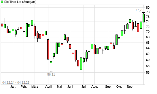 Mit dem Anstieg auf 76,16 EUR hat die Rio Tinto-Aktie (ISIN AU000000RIO1) am 03.12.2025 ein neues 12-Monats-Hoch erreicht und damit den Kurs vom 29.10.2025 eingestellt.