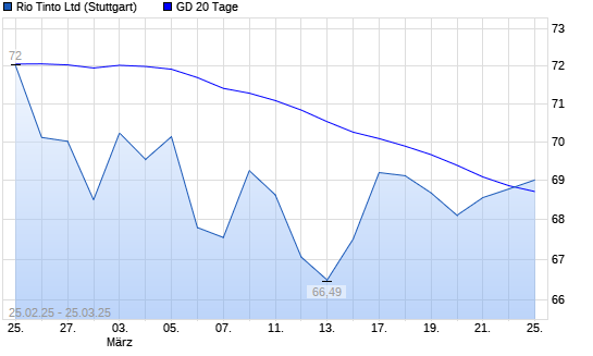 Mit dem Rücksetzer auf 68,82 EUR hat die Rio Tinto-Aktie am 24.03.2025 die 20-Tage-Linie nach unten gekreuzt.