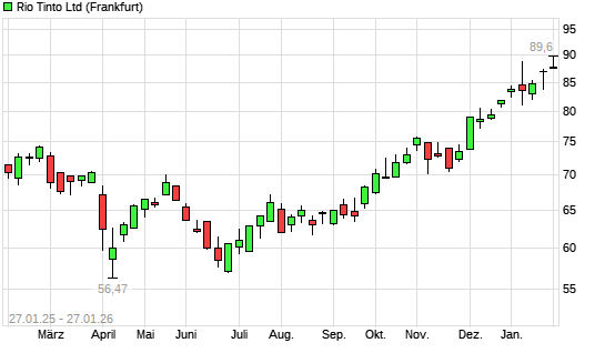Mit dem Anstieg auf 89,44 EUR hat die Rio Tinto-Aktie (ISIN AU000000RIO1) am 26.01.2026 ein neues All-Time-High erreicht und damit den Kurs vom 07.01.2026 eingestellt.Die Rio Tinto-Aktie befindet ...weiterlesen