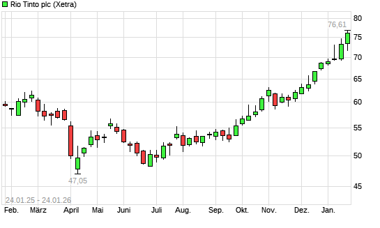 Mit dem Anstieg auf 76,48 EUR hat die Rio Tinto plc-Aktie (ISIN GB0007188757) am 23.01.2026 ein neues 3-Jahres-Hoch erreicht und damit den Kurs vom 21.01.2026 eingestellt.