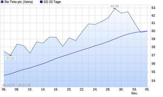 Mit dem Rücksetzer auf 59,00 EUR hat die Rio Tinto plc-Aktie am 04.11.2025 die 20-Tage-Linie nach unten gekreuzt.