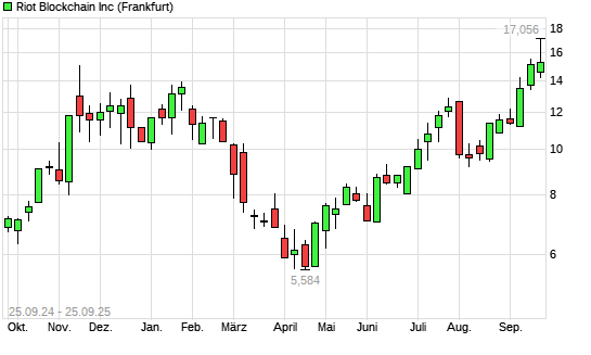 Mit dem Anstieg auf 15,46 EUR hat die Riot Platforms-Aktie (ISIN US7672921050) am 24.09.2025 ein neues 12-Monats-Hoch erreicht und damit den Kurs vom 19.09.2025 eingestellt.