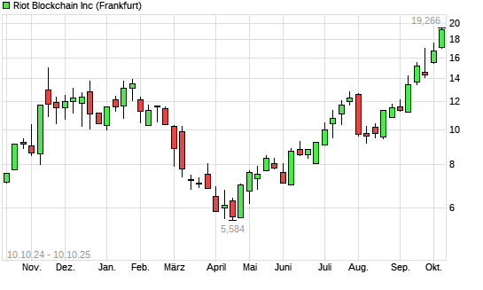Mit dem Anstieg auf 19,25 EUR hat die Riot Platforms-Aktie (ISIN US7672921050) am 09.10.2025 ein neues 3-Jahres-Hoch erreicht und damit den Kurs vom 08.10.2025 eingestellt.