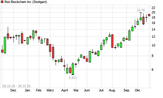 Mit dem Anstieg auf 19,75 EUR hat die Riot Platforms-Aktie (ISIN US7672921050) am 27.10.2025 ein neues 3-Jahres-Hoch erreicht und damit den Kurs vom 09.10.2025 eingestellt.