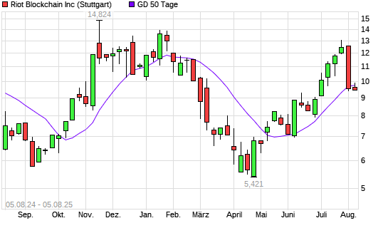 Mit dem Rücksetzer auf 9,65 EUR hat die Riot Platforms-Aktie am 04.08.2025 die 50-Tage-Linie nach unten gekreuzt.