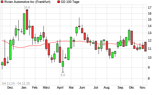 Mit dem Anstieg auf 11,50 EUR hat die Rivian Automotive-Aktie am 03.11.2025 die 100-Tage-Linie nach oben gekreuzt.