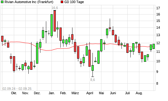 Mit dem Rücksetzer auf 11,46 EUR hat die Rivian Automotive-Aktie am 01.09.2025 die 100-Tage-Linie nach unten gekreuzt.