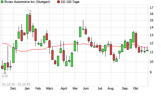 Mit dem Rücksetzer auf 11,22 EUR hat die Rivian Automotive-Aktie am 30.10.2025 die 100-Tage-Linie nach unten gekreuzt.