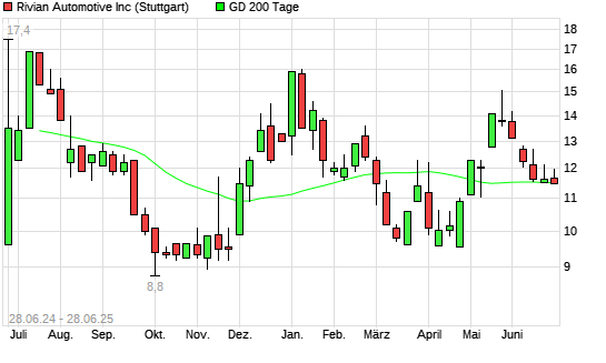 Mit dem Rücksetzer auf 11,50 EUR hat die Rivian Automotive-Aktie am 27.06.2025 die 200-Tage-Linie nach unten gekreuzt.