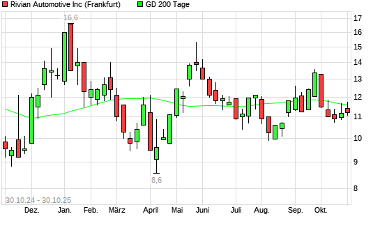 Mit dem Rücksetzer auf 11,58 EUR hat die Rivian Automotive-Aktie am 29.10.2025 die 200-Tage-Linie nach unten gekreuzt.