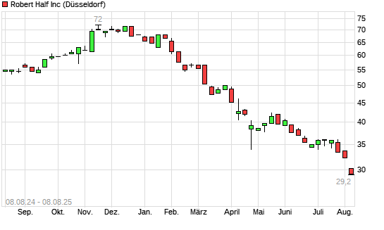 Mit dem Rücksetzer auf 29,40 EUR hat die Robert Half International-Aktie (ISIN US7703231032) am 07.08.2025 ein neues 10-Jahres-Tief erreicht und damit den Kurs vom 06.08.2025 eingestellt.