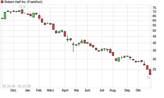 Mit dem Rücksetzer auf 23,40 EUR hat die Robert Half International-Aktie (ISIN US7703231032) am 30.10.2025 ein neues 10-Jahres-Tief erreicht und damit den Kurs vom 29.10.2025 eingestellt.
