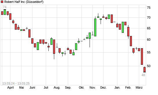 Mit dem Rücksetzer auf 49,40 EUR hat die Robert Half International-Aktie (ISIN US7703231032) am 12.03.2025 ein neues 3-Jahres-Tief erreicht und damit den Kurs vom 10.03.2025 eingestellt.