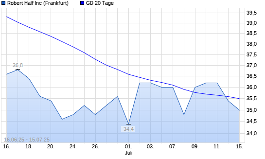 Mit dem Rücksetzer auf 35,40 EUR hat die Robert Half International-Aktie am 14.07.2025 die 20-Tage-Linie nach unten gekreuzt.