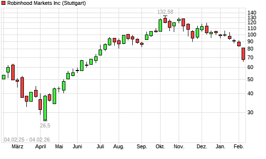 Mit dem Rücksetzer auf 73,11 EUR hat die Robinhood A-Aktie (ISIN US7707001027) am 03.02.2026 ein neues 6-Monats-Tief erreicht und damit den Kurs vom 02.02.2026 eingestellt.