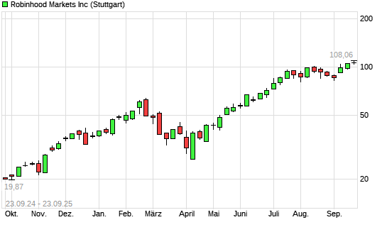 Mit dem Anstieg auf 106,00 EUR hat die Robinhood A-Aktie (ISIN US7707001027) am 22.09.2025 ein neues All-Time-High erreicht und damit den Kurs vom 19.09.2025 eingestellt.