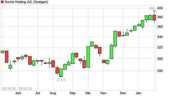 Mit dem Anstieg auf 390,20 EUR hat die Roche-Aktie (ISIN CH0012032113) am 27.01.2026 ein neues 3-Jahres-Hoch erreicht und damit den Kurs vom 26.01.2026 eingestellt.
