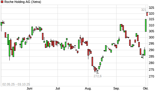 Mit dem Anstieg auf 321,20 EUR hat die Roche-Aktie (ISIN CH0012032113) am 02.10.2025 ein neues 6-Monats-Hoch erreicht und damit den Kurs vom 01.10.2025 eingestellt.