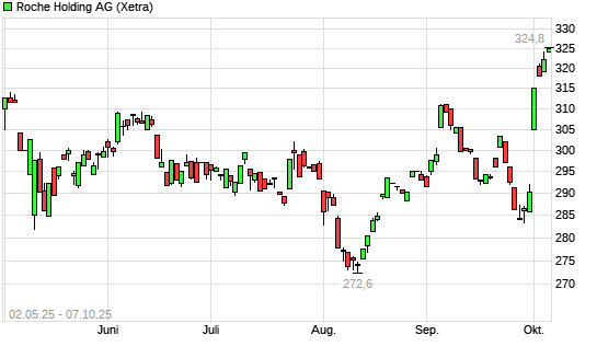 Mit dem Anstieg auf 326,20 EUR hat die Roche-Aktie (ISIN CH0012032113) am 06.10.2025 ein neues 6-Monats-Hoch erreicht und damit den Kurs vom 02.10.2025 eingestellt.