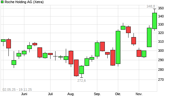 Mit dem Anstieg auf 342,60 EUR hat die Roche-Aktie (ISIN CH0012032113) am 18.11.2025 ein neues 6-Monats-Hoch erreicht und damit den Kurs vom 09.10.2025 eingestellt.