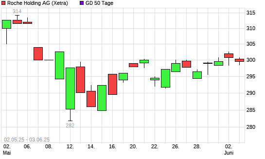 Mit dem Anstieg auf 300,20 EUR hat die Roche-Aktie am 02.06.2025 die 50-Tage-Linie nach oben gekreuzt.